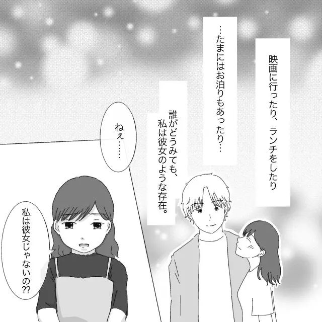 2人で映画に行ったり、ランチをしたり、たまにはお泊りもあったり・・・誰がどう見ても、私はレンの彼女のような存在でした。だけど私たちは付き合っていません。曖昧な関係に、私のモヤモヤは募っていくばかり。納得がいかない私は、レンに「ねぇ、私は彼女じゃないの?」と問いかけました。