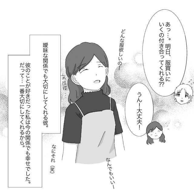 お互い好き同士だったものの、レンさんの過去の恋愛のトラウマが障害となり、恋人になれなかった2人。レンさんは、ミカさんに「付き合えない」と言ってからの方が優しくなりました。映画に行ったり、ランチをしたり、たまにはお泊りもあったり・・・誰がどう見ても、レンさんの彼女のような存在のミカさん。曖昧な関係に納得がいかないミカさんは、レンさんに「私は彼女じゃないの?」と問いかけます。しかし、レンさんの気持ちはあの時から変わりません。「ごめんね」と申し訳なさそうに謝る姿に、そんな悲しい顔をされたら私は何も言えなくなるじゃない・・・と言いたい気持ちをぐっと堪え、ミカさんは「ううん」と首を振りました。曖昧な関係でも、自分を一番大切にしてくれるなら彼女になれなくても平気。ミカさんはそう言い聞かせながら、レンさんと次の約束を取り付けます。