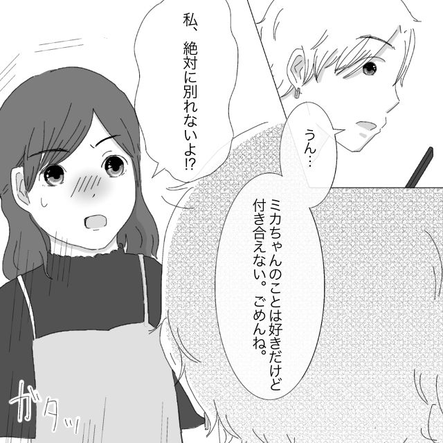 引っ込み思案で人見知りな大学一年生のミカさんは、インカレサークルでレンさんと出会います。コミュ力が高くて周りへの気遣いもできるレンさんは、サークルに馴染めていない人にも積極的に声をかけ、どんどん仲のいい人を作っていきます。ミカさんもそんな彼に声をかけてもらった一人でした。「サークルの連絡とかあるから連絡先教えて」と言われ、ドキドキしながら連絡先を交換。はじめは頻繁にくる連絡に戸惑うミカさんでしたが、レンさんの優しい言葉と気遣いに惹かれていきました。知り合ってしばらくが経ち、2人で会う約束も増えてきた頃、気持ちを抑えきれなくなったミカさんは思い切ってレンさんに告白。一瞬驚いた表情を見せるレンさんでしたが、「オレも好きだよ」とミカさんの欲しかった返事をくれました。しかし、「でもオレ、いつも付き合った人にフラれるんだ・・・ミカちゃんにもフラれるかもしれないって思うと付き合うのが怖い、だから付き合えない」と悲しそうに言いました。ミカさんは「私は今までの彼女と違うよ?」と伝えますが、レンさんの気持ちは変わりません。「付き合えなくても、今と変わらず仲良くしてくれる?」と言うレンさんに、「うん・・・これからもよろしくね」とフラれたショックを隠すように笑って返事をしました。