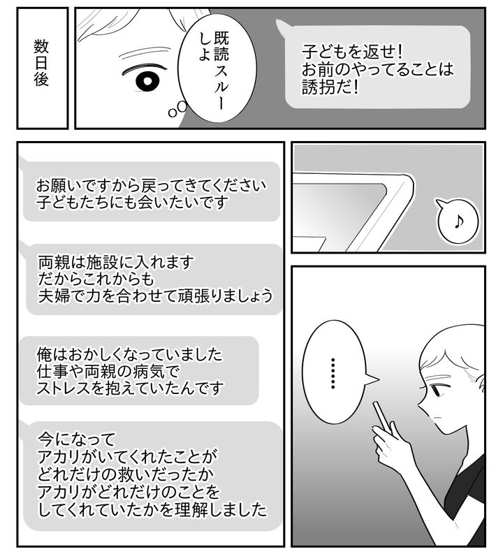 私がいなくなったと知った夫は何度もスマホに電話をかけてきました。最初は出ていましたが、夫は感情的にただ怒鳴りつけてくるだけ。だからサクッと着信拒否しました。するとしまいには、懇願するようなメッセージが来るようになり……。