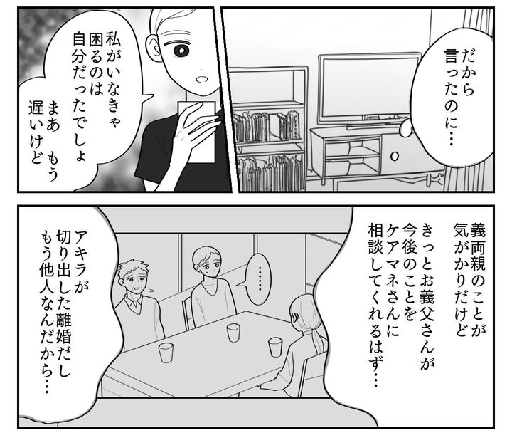 これまでサポートしてきた義両親のことが気がかりではありますが、きっと義父がケアマネジャーさんと相談しながら決めていくことでしょう。離婚した私はもう他人だし、ましてやこの離婚は夫が言いだしたのだから、私が気にしてもしょうがないこと。そう思って考えないようにします。