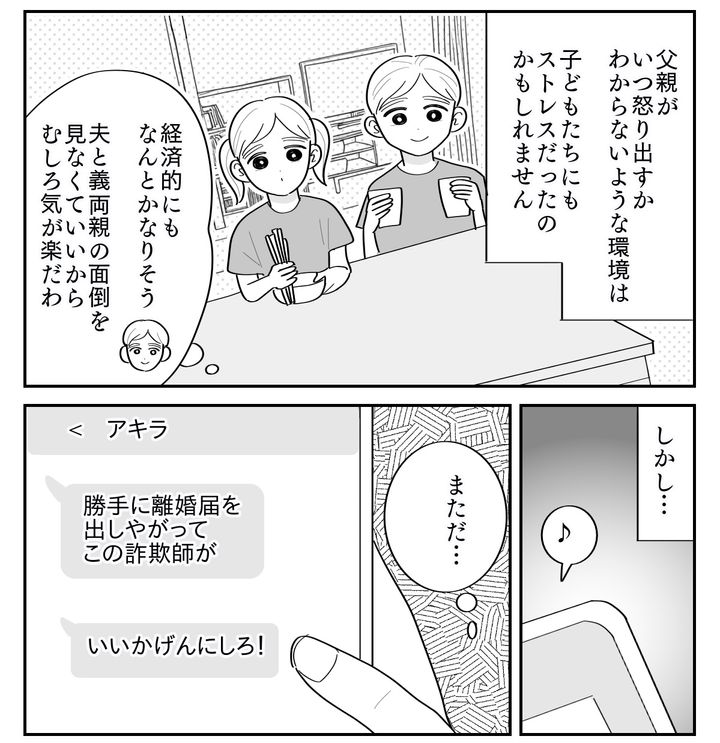 私は会社員のアカリ(35歳)。夫のアキラ(40歳)と結婚して息子(7歳)と娘(5歳)がいます。3年ほど前、義実家同居をはじめました。しかし夫はそれ以来、私に対してやたら威圧的な態度になり……。認知症がすすんだ義母の施設入居を検討すると言うと、夫は「介護をしないなら出ていけ」と離婚届を突きつけてきました。そんな理不尽なことを言うなら、お望みどおり出ていきます! 私は小さなアパートを借り、子どもたちとの新生活をスタートさせました。