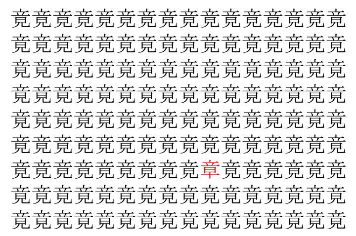 画像の中には、「竟」という漢字が縦に9行、横に16個並んでいます。 全部で144個となりますが・・・、そのうち1つは「異なる漢字」となってますよ!!
