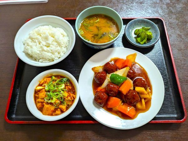 肉団子甘酢定食は小鉢の麻婆豆腐が付いて850円