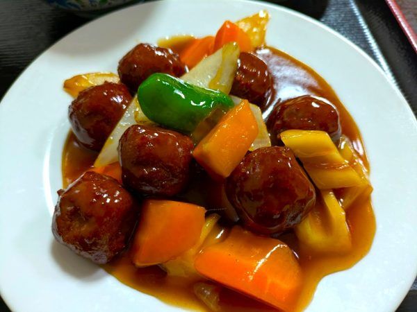甘酸っぱい肉団子甘酢です。ちょっと汗をかいてきました。