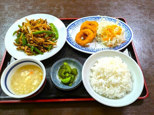中華日替りランチ 850円 金曜日の中華日替りランチは青椒肉絲定食です。青椒肉絲に、イカの唐揚げ・漬物・ご飯・スープ付きです。ボリューム満点ですね!