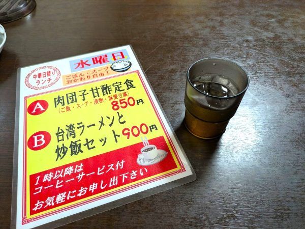 ランチメニューの看板が目立ちますね。思わず立ち止まって見てしまいます。(笑)中華日替りランチがお得なようです。ランチは、ごはん・スープのおかわりが自由で、13時以降のお客様はコーヒーのサービス付きだそうです。時計をみると、余裕で13時を過ぎていました。コーヒーをいただきましょう!