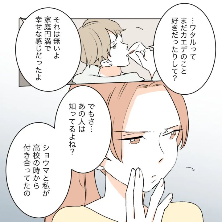 カエデは高校時代、両片想いだったワタルに想いを伝えられず、お互いに別の人と付き合ったと誤解したまま卒業しました。カエデに『ワタルに近づくな』と脅す手紙が届くようになり、その頃に妹サクラが不審なケガをしたことで、カエデがワタルと距離を置くようにしていた間にワタルと一緒にいるようになったシズクが、「嫌がらせの手紙が届いた」とカエデに相談したうえで「ワタルが私のそばにいてくれると言った」と伝えたことでカエデはワタルを諦めました。一方ワタルはシズクから嫌がらせの手紙がカエデに届いたことを聞き、シズクと付き合っている噂が出れば嫌がらせはおそらくシズクに向くため、カエデとワタルがまた一緒にいられるようになるというシズクの提案を受け躊躇しました。でもカエデが望んでいると言う嘘を信じ、ワタルはカエデのためにシズクと行動を共にするようになりました。ところがある日、シズクに誘われてカエデの家へ行ったワタルは、そこにショウマがいることを目の当たりにしてカエデを諦めました。本当はショウマはカエデの妹サクラと付き合っていたことをワタルは知らなかったのです。サクラとショウマはシズクの自作自演を疑いましたが、手紙の犯人も、シズクがワタルとカエデを引き裂いたかどうかも分からないまま卒業し、大人になってワタルはシズクと、そしてショウマはサクラと結婚しました。数年後カエデは地元に帰り、ワタルとシズクに再会しました。小学校の同級生で仲の良いシズクの娘ミズキとカエデの娘アカネのためにシズクと関わりを絶つことはできないカエデですが、シズクに内緒でワタルと連絡先を交換しました。