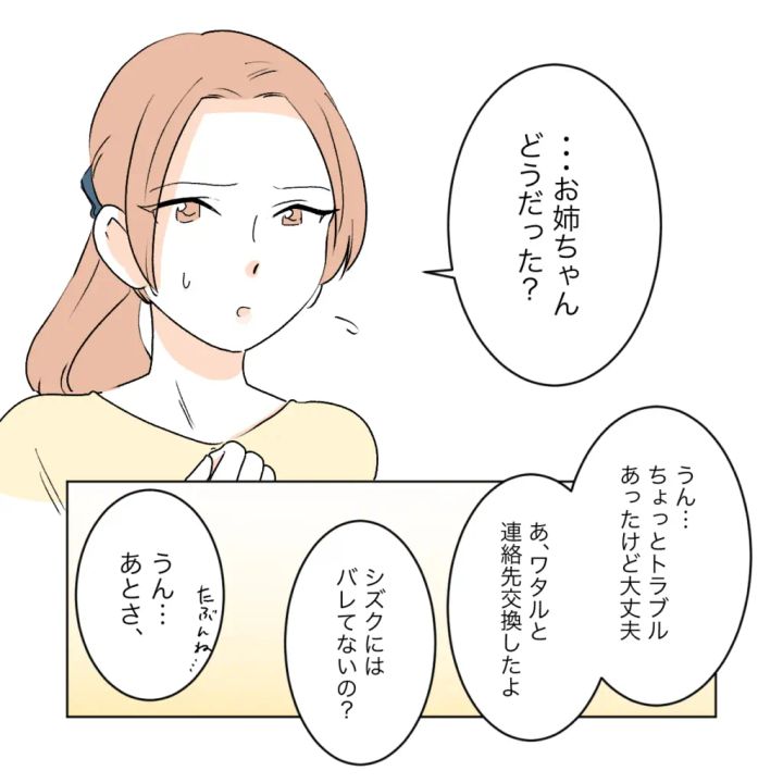 すぐに「お姉ちゃん、どうだった?」と心配そうに聞くサクラに、カエデはジュースのトラブルがあっても特に問題なく過ごしたことや、シズクには内緒でワタルと連絡先を交換したことを伝えました。