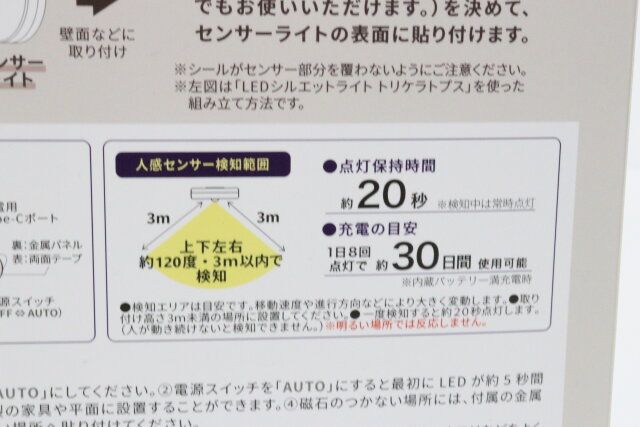 人感センサーの検知範囲は上下左右約120度、3m以内で検知。検知すると約20秒間点灯します。