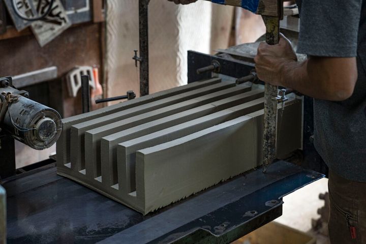 フィリップ・マルインの作品《Extrude / Cut》の制作プロセス。タイルメーカーで出合った2 つの技法「粘土の押し出し成形」と「ワイヤーカット」が出発点となっている。