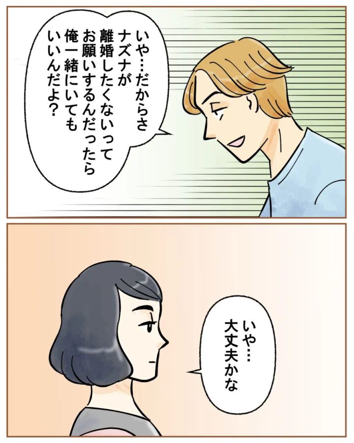 すると、「いや・・だからさ、ナズナが離婚したくないってお願いするんだったら俺一緒にいてもいいんだよ?」となぜか上から目線のツカサ。私は冷めた目でツカサを見ながら「いや・・大丈夫かな」ときっぱり。