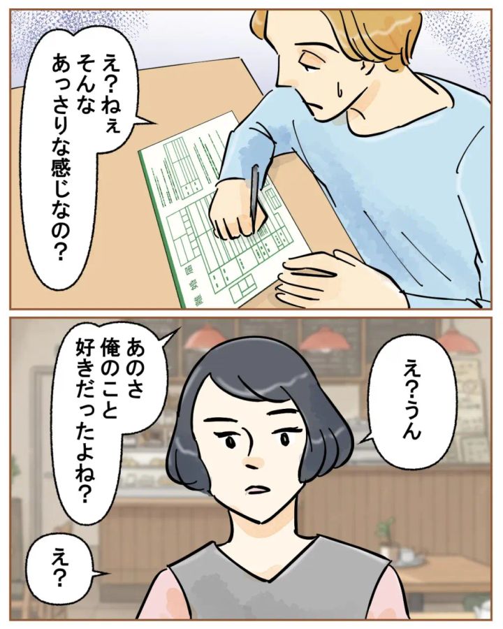 ツカサが離婚届に記入しながら「え?ねぇ、そんなあっさりな感じなの?」と探るように聞いてきたので「え?うん」と真顔で答えると、「あのさ、俺のこと好きだったよね?」と言ってきました。私はツカサが何を言いたいのか分からず「え?」と聞き返しました。