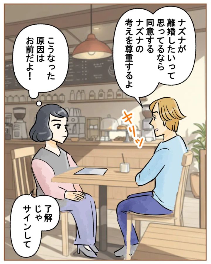 後日、離婚についての話し合いをするため、私はツカサとカフェで待ち合わせをしました。ツカサは「ナズナが離婚したいって思ってるなら同意する。ナズナの考えを尊重するよ」を物わかりの良いような口ぶりで言ってきましたが、私は「こうなった原因はお前だよ!」と心の中で突っ込みながら「了解。じゃ、サインして」と淡々と答えました。