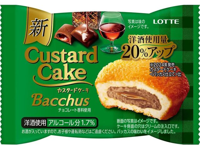 ・カスタードケーキでバッカスの味わいを表現した、洋酒香る大人のためのカスタードケーキです。洋酒使用量が20%アップ(※1)して、コニャック(※2)の熟成した芳醇な香りと洋酒感を堪能できます。 ・コニャック(※2)を使用したふわふわのケーキの中には、チョコカスタードクリームとコニャックソースを閉じ込めました。 ※1 2024年カスタードケーキ<バッカス仕立て>比 ※2 コニャック52.4%(ブランデー中)