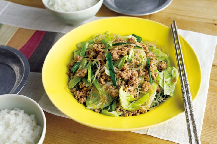 こっくりみそ味の豚ひき肉とキャベツが、ご飯を誘う味わい。水もどし不要の春雨は、具材の下に潜ませるだけで、つるんぷるんの食感が楽しめます。