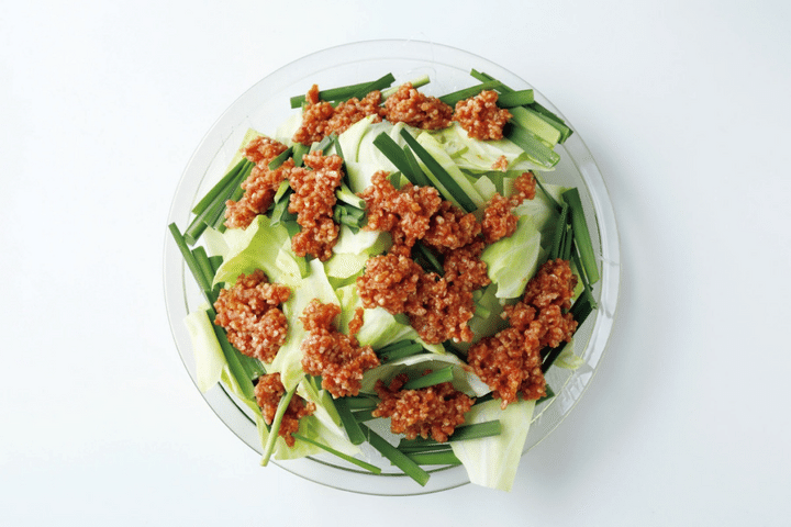 直径約25cmの耐熱皿に、春雨を広げる。キャベツ、にらと、(1)のひき肉をところどころにのせて、水1/2カップを回しかける。