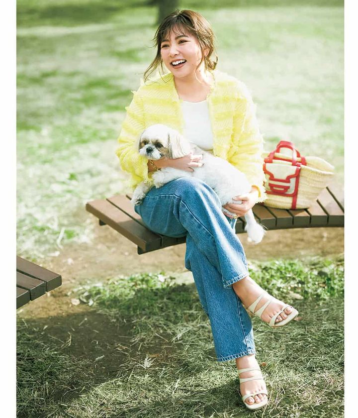 マシュマロさんの温かさを押し上げてくれるレモンカラーのツイードジャケット。ワザありジャケットだからこそ、インナーとパンツはシンプルにすっきりと。