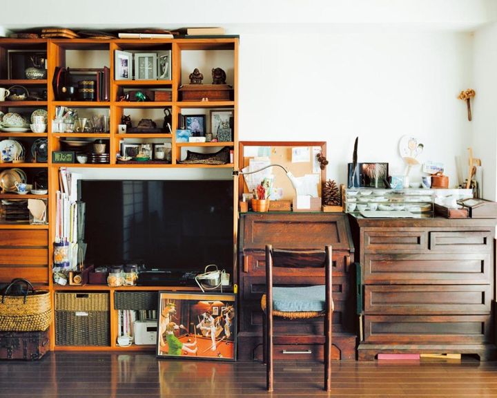 60年使っているチェストとライティングビューローは「松本民芸家具」のもの。入居後に「ニトリ」でオープン棚を買い足し、両親の写真やお気に入りの食器などの定位置に。