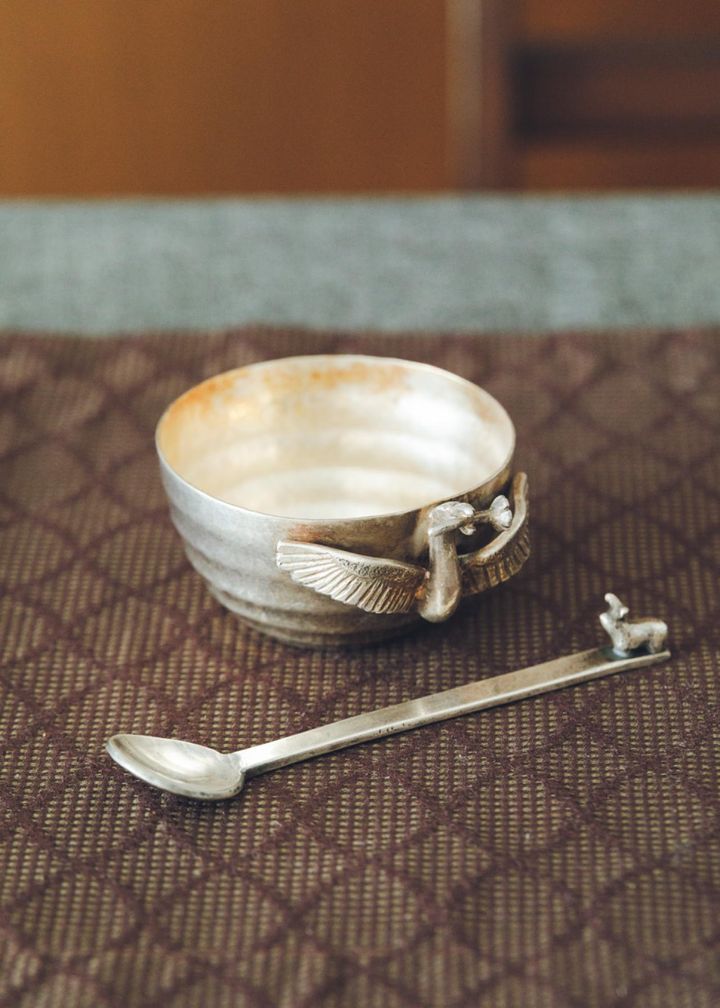 若い頃に雑誌で目にして以来、長谷川竹次郎さんの銀器に憧れていた。高価なのでなかなか買えずにいたが、娘さんの知人が営むギャラリーで個展があり、匙と花喰鳥(はなくいどり)にひかれた盃を自分へのご褒美として買い求めた。