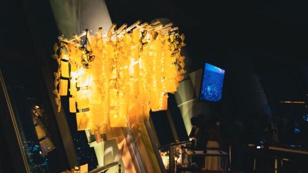 イチョウをイメージした照明が金色の光で展望台内のステージを美しく照らし、うっとりするような空間を演出。