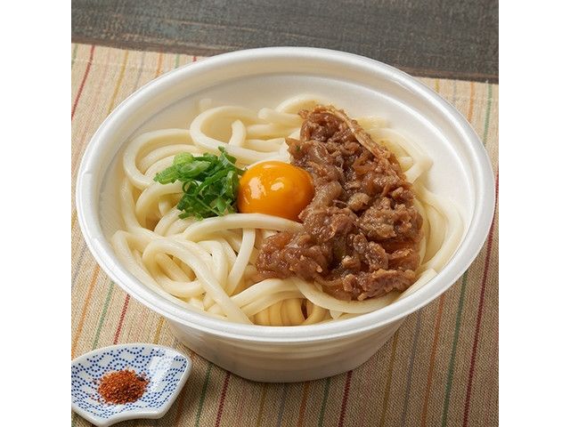 甘辛く味付した牛肉玉ねぎ炒め、卵黄ソース、青ねぎをのせた混ぜうどんです。レンジであたため、よく混ぜてお召し上がりください。 ※和歌山県の一部では取り扱いがございません。