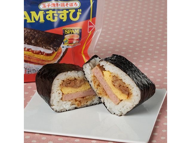 SPAM®と、おむすび製造工場で毎日香ばしくふっくら焼き上げたたまご焼き、甘辛く炒めた鶏そぼろをサンドしたおむすびです。
