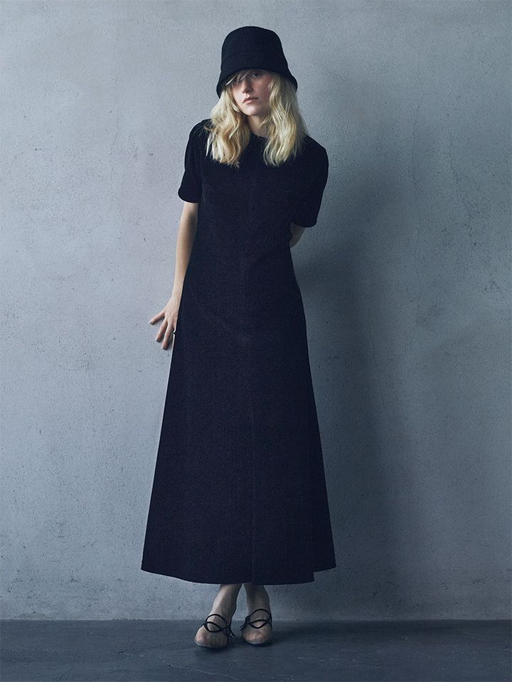 着飾るのが目的ではなく、腰位置を高くし、ボディラインをキレイに見せるためのフレア。半そでよりやや長く、5分までいかない絶妙なそで丈も計算済みのバランス感。実は地厚なコーデュロイ素材だから、フォーマルな形を日常づかいしやすく。