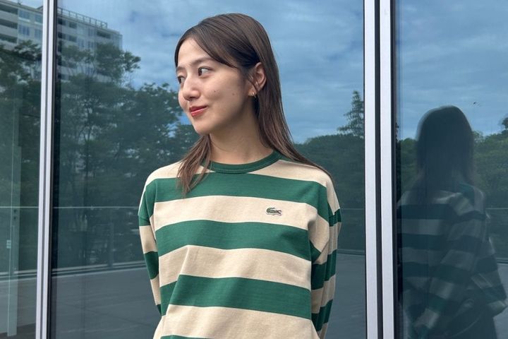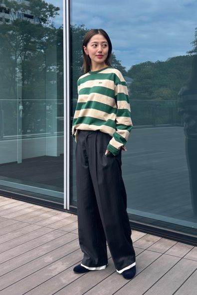 「太めのグリーンボーダーを主役に、黒のワイドパンツで全体を引き締めました。裾からのぞく裏地とネイビーのシューズで抜け感をプラス。シンプルながら大人っぽさも意識し、リラックス感のある着こなしに仕上げました」