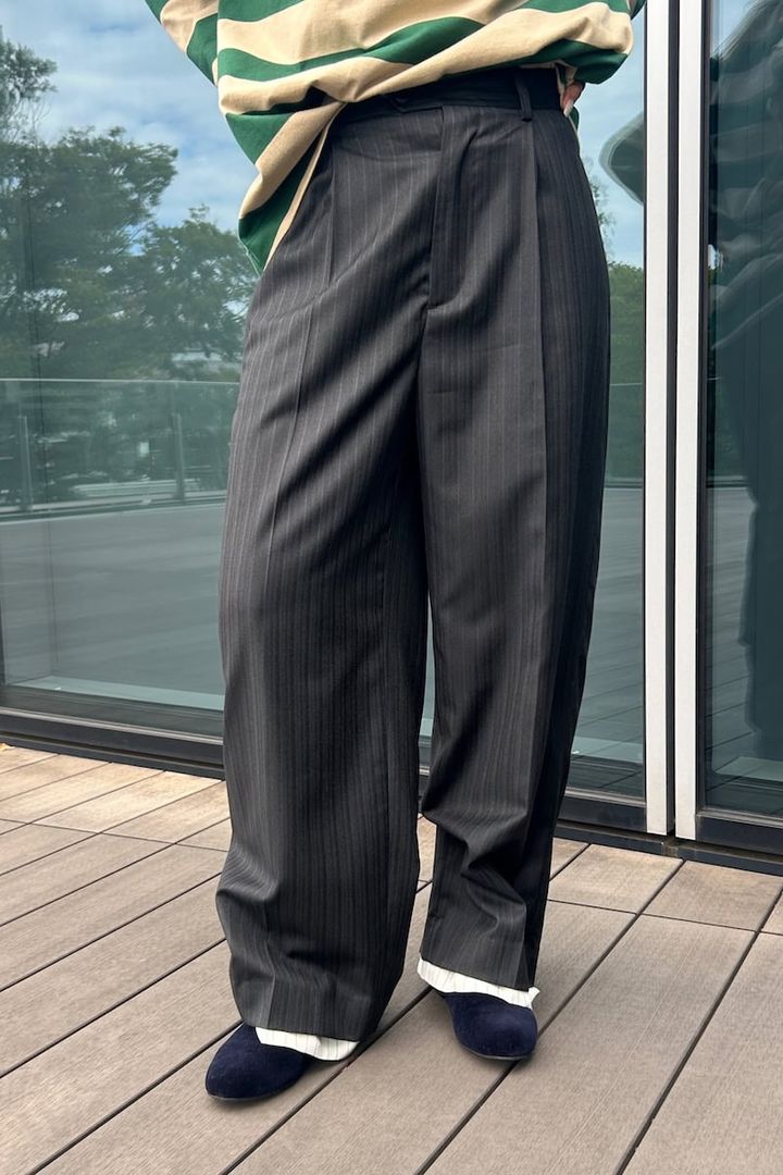 ほどよいゆとりを感じさせるワイドシルエットのパンツは、ほんのりストライプ柄をのせることで、着こなし全体がすっきりスマートに。裾からちらりとのぞく裏地が軽やかさも演出しています。
