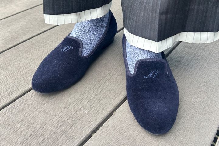 ネイビーのオペラシューズにブルーのソックスを合わせ、上品さと遊び心を両立。