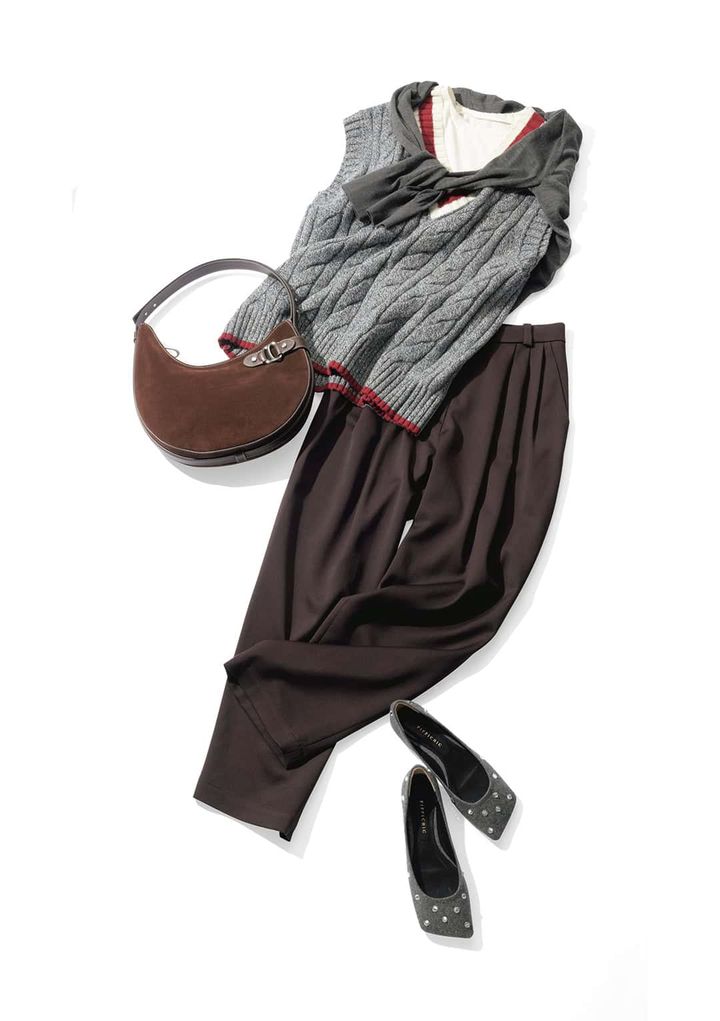 ニットベスト¥9,460(ミラ オーウェン/ミラ オーウェン ルミネ新宿2店)Tシャツ¥12,100(HER.)カーディガン¥47,300(チノ/モールド)パンツ¥49,500(アロー) バッグ¥62,700(ローレン ラルフ ローレン/ラルフ ローレン)パンプス¥46,200(ピッピシック/ベイジュ)