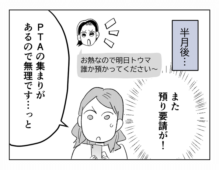 今回の主人公は30代のパート主婦・チサトさん。家族との時間をしっかり取りたいためパート勤務をしています。いっぽう近所に住む義妹・アヤさんは、出産後もフルタイムでがっつり働いているそう。しかし小さい子どもを抱えてバリバリ働くのは大変……ということで、お義母さんやチサトさんに頼ることもしばしば。しかも息子・トウマくんが熱をよく出すようで、そうなると「預かれませんか?」のメッセージの嵐。パートだと断ったときにはトウマくんを自宅玄関で押しつけられたそうです。