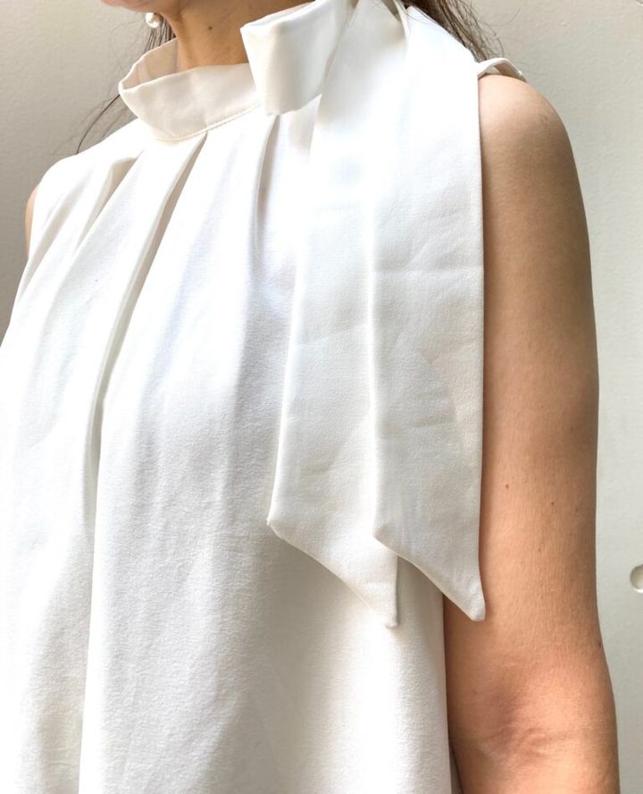 「『CAWAII』のこのシャツは、首周りのデザインも好きなのですが、大きめのリボンがポイントです。太い2本のリボンは自由にアレンジができるので、結んだり垂らすだけでも雰囲気が変わります。そしてやっぱり、白をトップスに持ってくると顔周りが明るくなりますよね」