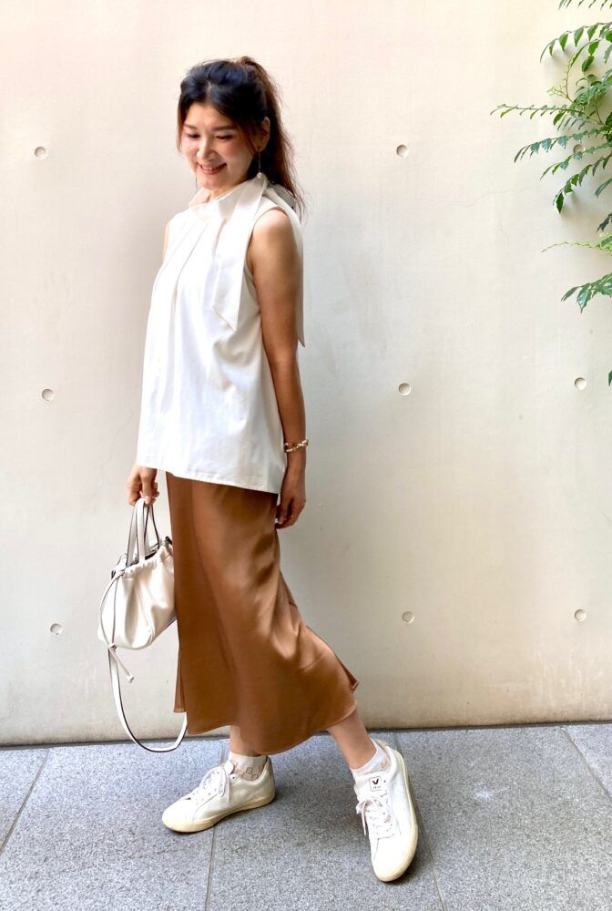 最近、スニーカーをはき始めたという岡野谷さん。「大人カジュアルに決めたい時は『VEJA』の皮素材スニーカーが使いやすい!明るい色合いのコーデになじむんです」