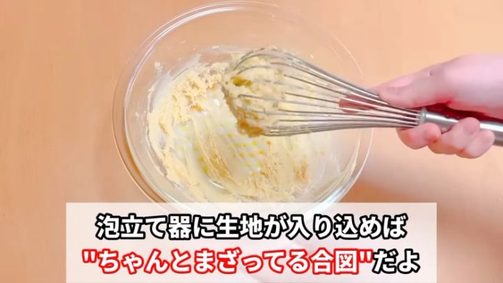 いくら混ぜても生地が分離してしまう場合は、ホットケーキミックスを少量加えるとまとまります。泡立て器に生地が入り込むようになれば、しっかり混ざっているサインです。