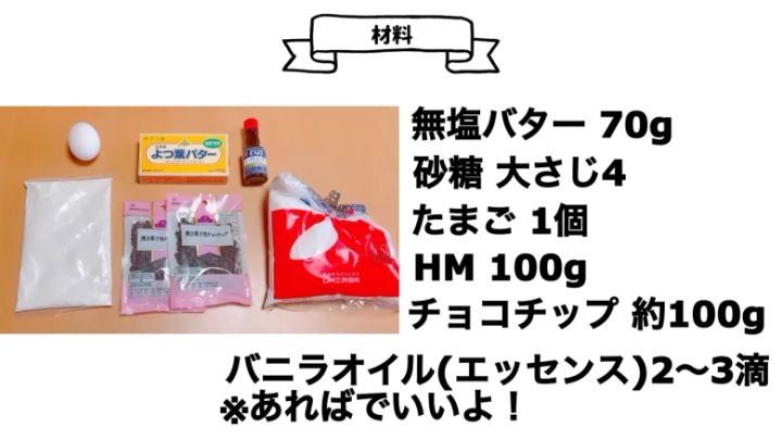 まずは、チョコチップクッキーの材料から確認していきましょう。