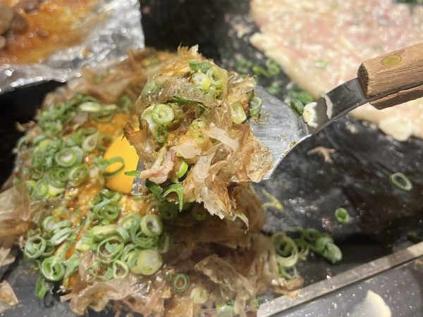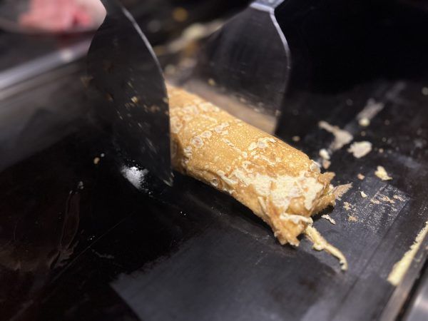 鉄板焼きで目の前で仕上げてくれる卵焼きもおいしかったです。私は、明太子をプラスでトッピングし、最後にマヨネーズをかけてもらって完成!ふわふわで、味はちょっと濃いめ。マストで頼むべき逸品でした。