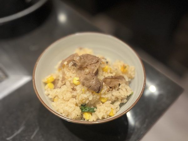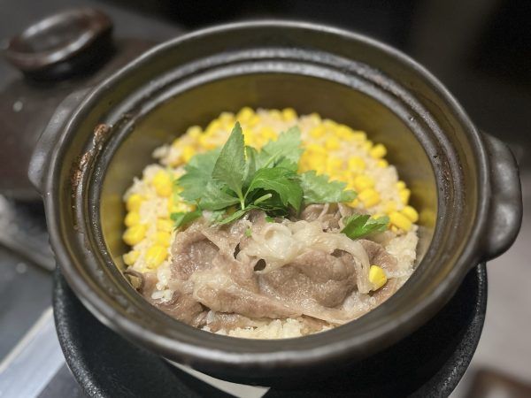 〆は、コーンと牛肉の土鍋ご飯にしました。