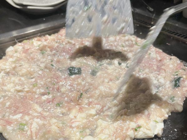 店内で捌いているというフレッシュな真鯛と、大根、そして優しい味に仕上げるポイント・豆腐を混ぜ、特製の出汁でもんじゃにしていきます。