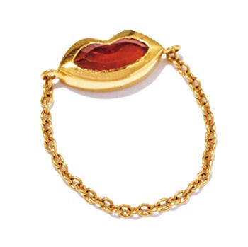 リップリング/Pignatta(ZUTTOHOLIC) つややかなリップモチーフのチェーンリング。ストーンで表現された唇が、手元にユニークな遊び心をプラス。華奢なゴールドチェーンだから、キャッチーなデザインでも品よくまとまるのが嬉しい。ネイルとのカラーコーディネートを楽しむのも〇。