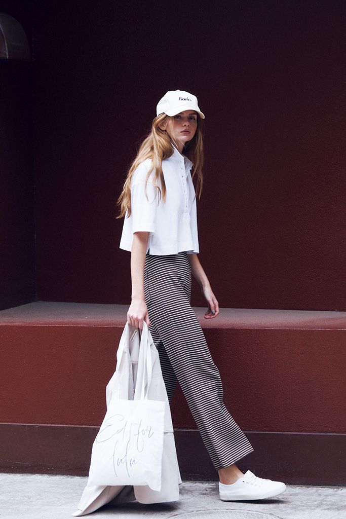 ベージュワイドジャケット/SeaRoomlynn 白ショート丈ポロシャツ(オンライン限定) /Gap ブラウン×白ボーダーニットパンツ/PHEENY 白ロゴトートバッグ/エディット フォー ルル 白スニーカー/FEDERAL PRISON INDUSTRY(メイデン・カンパニー) キャップ/パシフィック(ジャーナル スタンダード レサージュ 丸の内店)