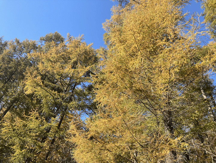 カラマツは森の紅葉シーズンのラストを飾り、10月下旬から11月にかけて黄色く染まります。