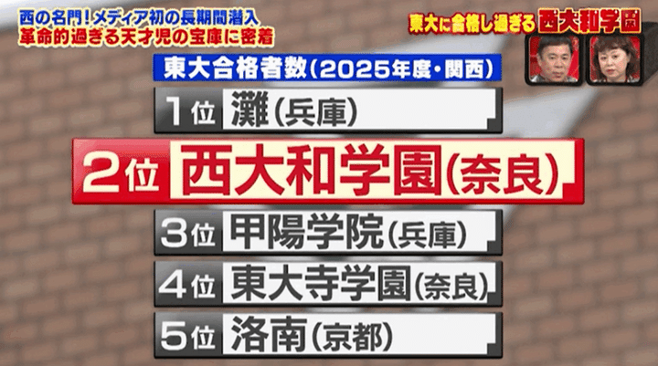 なるみと岡村が興味を持ったのは、奈良県にある⻄⼤和学園。約1700⼈の天才児たちが通う、中⾼⼀貫の男女共学校だ。同学園は、2025年度に44人の東大合格者を輩出し、関西における東大合格者数ランキングで2位を獲得。2021年度の東京大学・京都大学の医学部合計合格者数においては、なんと全国ナンバーワンだ。