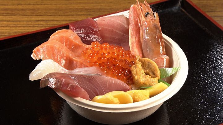 店員さんにカードの意味を聞いてみると、津軽の方言で「たんげ、めぇ」は「とてもおいしい」、「け」は「食べてください」という意味だそう。青森のご当地グルメを沢山食べて、その魅力をみんなに伝えてほしい、とお願いされたメンバーが最初にいただく青森グルメは、”のっけ丼”。市場の様々な店舗で売られている海鮮具材をチケット方式で購入してオリジナル丼を作るという仕組みで、大人気だという。