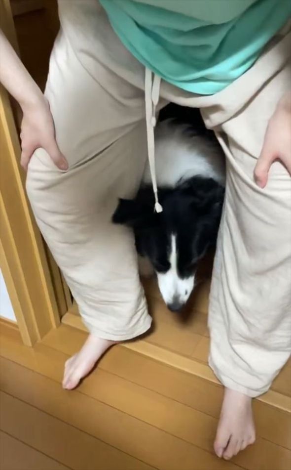 家の中を移動し、ドアを通ろうしているこの子は、ボーダーコリーの『ジル』くん。 その際、飼い主さんの両足の間をくぐろうとしていました。