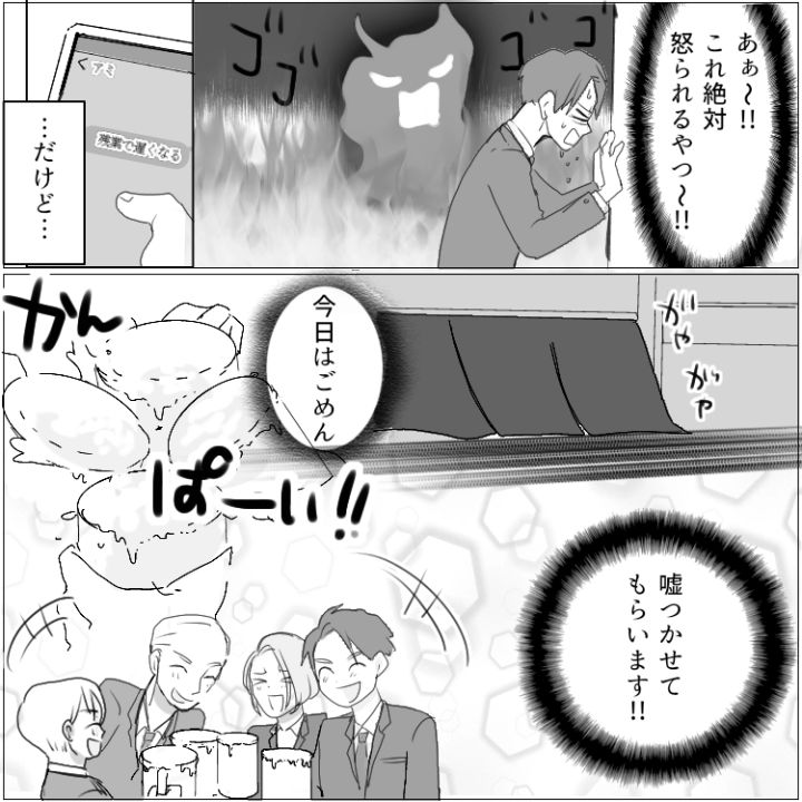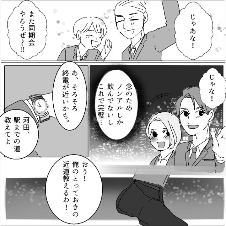 ケイスケは毎日家事・育児に奮闘する1児のパパ。しかし、妻・アミの尻に敷かれることが多く、グッタリ疲れてしまう日々だった。そんなある日、同期の白石と偶然社内で再会する。以前に彼女に想いを寄せていたため、久しぶりの再会に胸を躍らせるケイスケ。急遽、同期で集まって飲みにいくことになったので、ケイスケはアミに嘘をついて参加する。しかし、飲み会終わり、衝撃のトラブルが発生することに!?