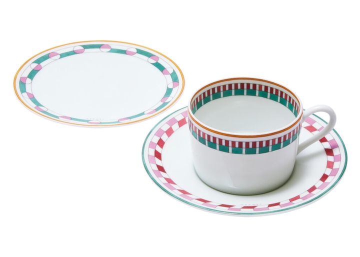 ティーカップ[∅7.5×H5.5㎝]、ソーサー[∅14.5㎝]セットで¥42,900、パンプレート[∅14㎝]¥19,800(ともにエルメスジャポン 03−3569−3300)