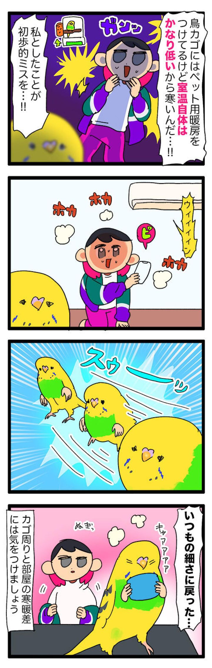 セキセイインコは極端に寒さに弱い鳥ではないのですが、カチョはまだ一歳未満の子供なので、冬場は成鳥よりも暖かくしてあげると安心です。
