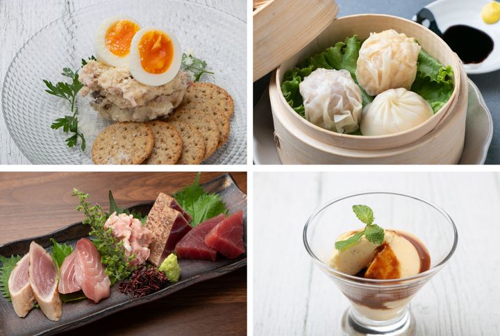ディナータイムには、ふきを甘辛く煮た「大山のきゃらぶき」をポテトサラダと和えた「きゃらぶきポテトサラダ」や、小籠包・シュウマイ・エビシュウマイを食べ比べできる「四五六菜館 点心3種食べ比べ」、三崎のまぐろを食べ比べできる「三崎のまぐろ 5種盛り食べ比べ」、卵を贅沢に使用した「愛川のたまごプリン」など、日本酒やビールにも合うお料理を楽しめます。